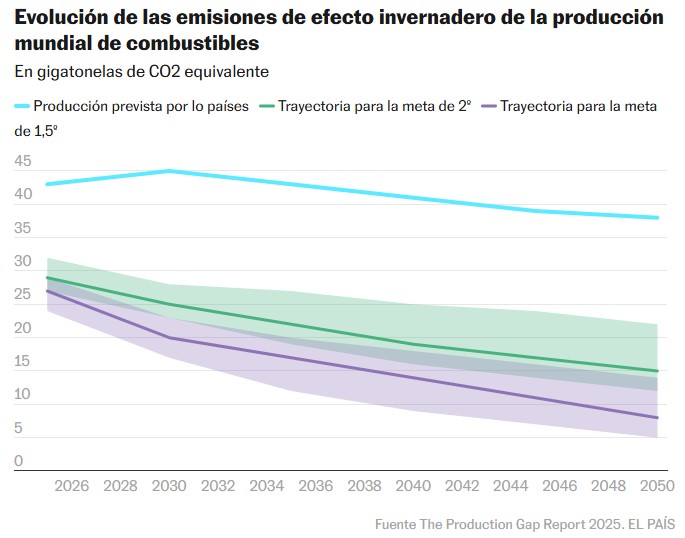 Para lograr los recortes de emisiones que prometen los países en sus planes es imprescindible alejarse de los combustibles fósiles, y una década después de firmarse París, las señales que envían los Gobiernos todavía no son suficientemente robustas. Según el Informe de la Brecha de Producción 2025, elaborado por el Instituto de Medio Ambiente de Estocolmo, Climate Analytics y el Instituto Internacional para el Desarrollo Sostenible, la senda no es la adecuada. Para 2030, los países proyectan ahora una producción de combustibles fósiles de más del doble (un 120%) de lo que es compatible con dejar el calentamiento en 1,5 grados, y un 77% por encima de la senda de los 2 grados.