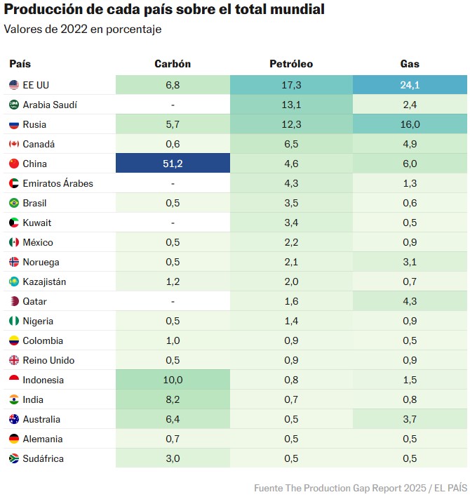 La trayectoria que marcan las previsiones de los países de aquí a 2050 apunta a una caída en la extracción del carbón, pero un incremento en el caso del petróleo y el gas. “La producción total proyectada de combustibles fósiles en 2050 sigue siendo más de 4,5 veces más alta que los niveles consistentes con limitar el calentamiento a 1,5 grados, y 2,5 veces más alta que los niveles consistentes con un límite de 2 grados”. advierten los autores. Estos planes no solo “socavan” los propios “compromisos del Acuerdo de París de los países”, sino que “van en contra de las expectativas de que, bajo las políticas actuales, la demanda mundial de carbón, petróleo y gas alcanzará su punto máximo antes de 2030″.