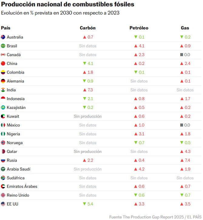 La anterior edición de este estudio data de 2023, y los expertos advierten de que la brecha entre lo que se necesita y las previsiones de producción se ha agrandado. Es decir, los países productores prevén ahora extraer más combustibles en 2030 que hace dos años. Precisamente en la cumbre del clima de aquel 2023, la COP28 celebrada en Dubái, los 200 firmantes del Acuerdo de París se comprometieron en la declaración final a dar la espalda a los combustibles fósiles.